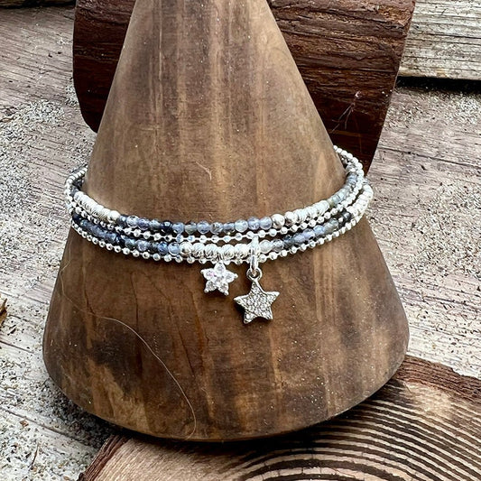 Bracelet femme multi-rang THE COSMIC BRAT – perles de cordiérite facettées, pendentifs étoile zircons et chaîne boules argent 925