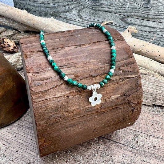 Collier perles femme LICK MY MINT – perles de malachite, & pendentif fleur miroir en argent 925