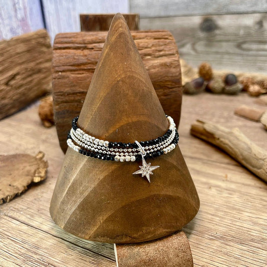 Bracelet femme BURN MY NIGHT, LOVER – multi-rangs en perles de tourmaline noire, argent 925 et pendentif étoile du Nord