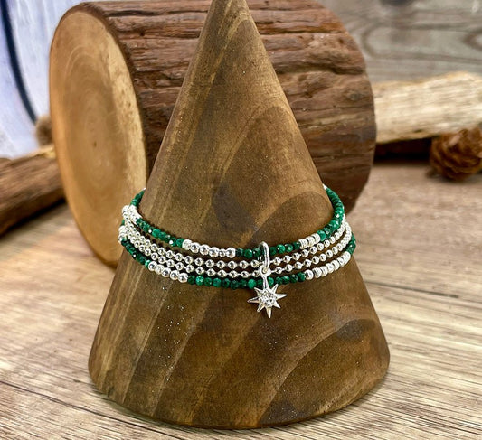 Bracelet multi-rang femme argent 925 DROP IT LIKE IT’S GREEN – perles de malachite & pendentif étoile du Nord zircon façon diamant