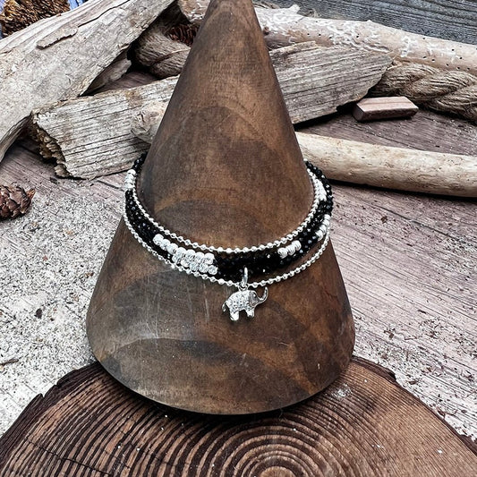 Bracelet femme multi-rang ELEPHANTASTIC – perles de spinelle noire, pendentif éléphant zircon et argent 925