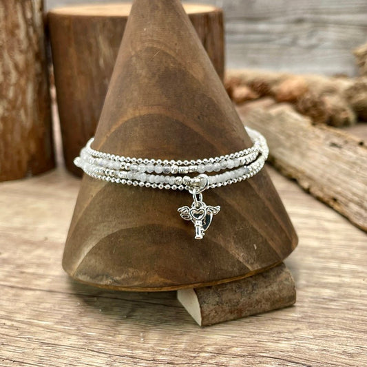 BRACELET femme multi-rang UNLOCK MY SPELL – perles de pierre de lune arc-en-ciel et pendentifs cadenas cœur & clé ailés argent 925