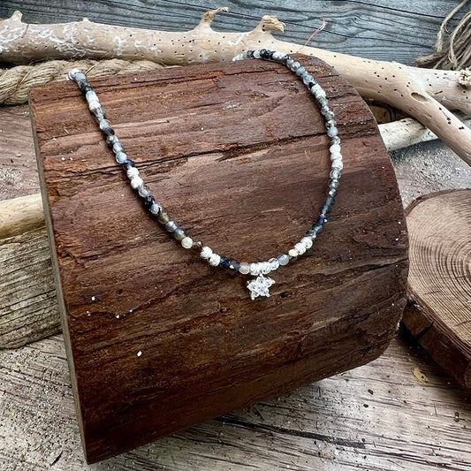 Collier perles femme MAKE WAVES, BABY – perles d’apatite facettées, & pendentif étoile de mer oversize en argent 925