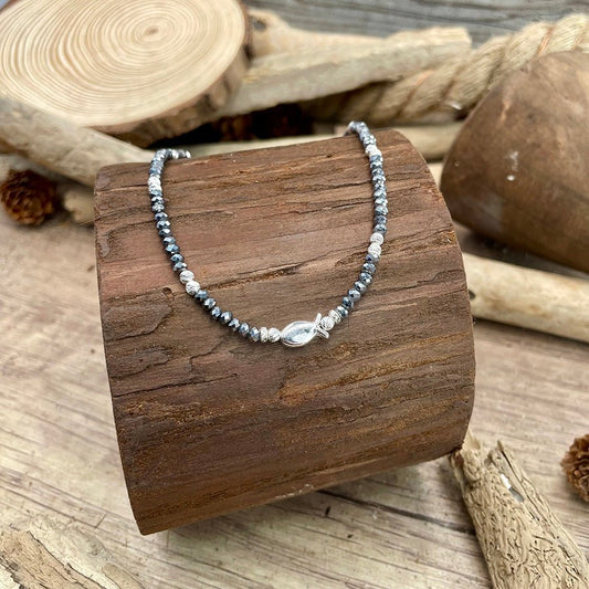 Collier perles femme CATCH MY SHINE – perles rondelles facettées en térahertz & pendentif poisson miroir en argent 925