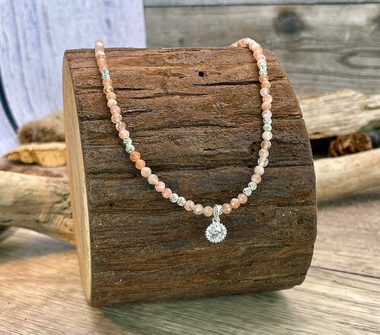 Collier perles femme JUICY & UNSTOPPABLE – perles de pierre de soleil facettées, perles facettées scintillantes & pendentif rond halo zircon façon diamant en argent 925