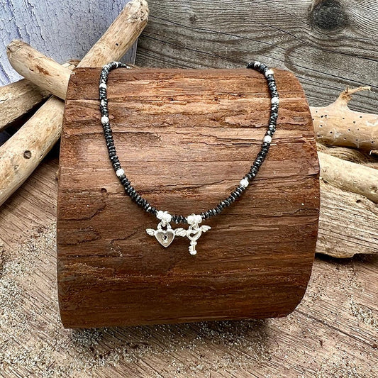 Collier perles femme KEEP OUT, DARLING, I'M BUSY – perles d’hématite facettées, pendentifs cœur cadenas & clé ailée en argent 925