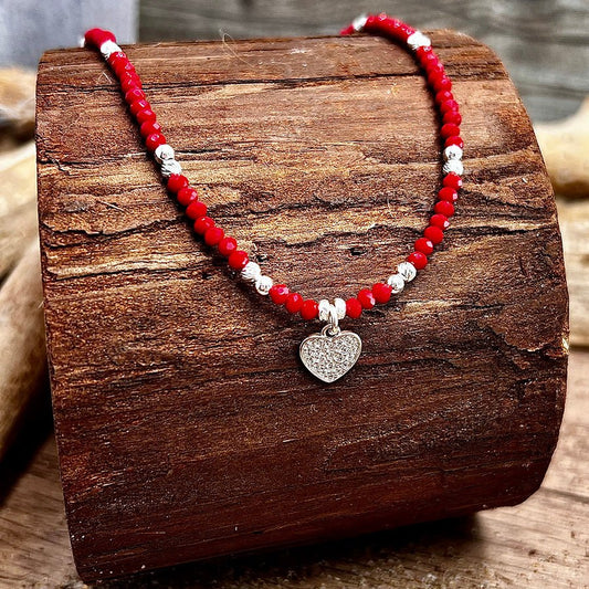 Collier perles femme LIGHT MY FIRE – perles en pierre fine de corail bambou facettées & pendentif cœur pavé de zircons façon diamant en argent 925