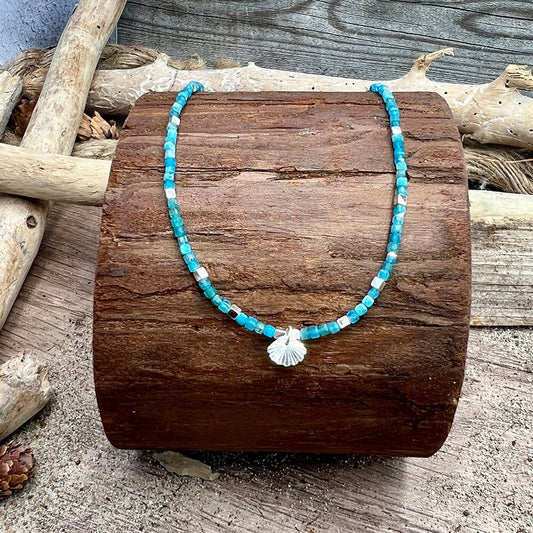 Collier perles femme OCEAN FLIRT – perles carrées en pierre fine d’apatite & pendentif coquillage facetté effet miroir en argent 925