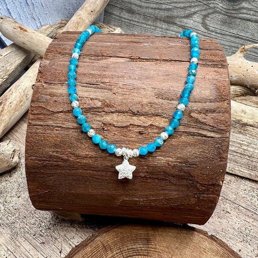 Collier perles femme STAR POWER, SWEETHEART – perles d’apatite facettées, & pendentif étoile bombée pavée de zircon en argent 925