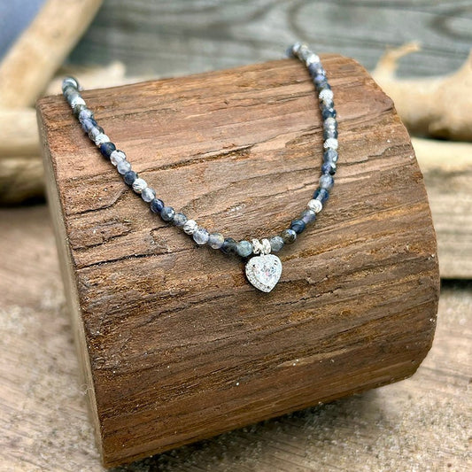 Collier perles femme FREEZE ME & LOVE ME – perles de cordiérite facettées, & pendentif cœur halo zircons façon diamant en argent 925