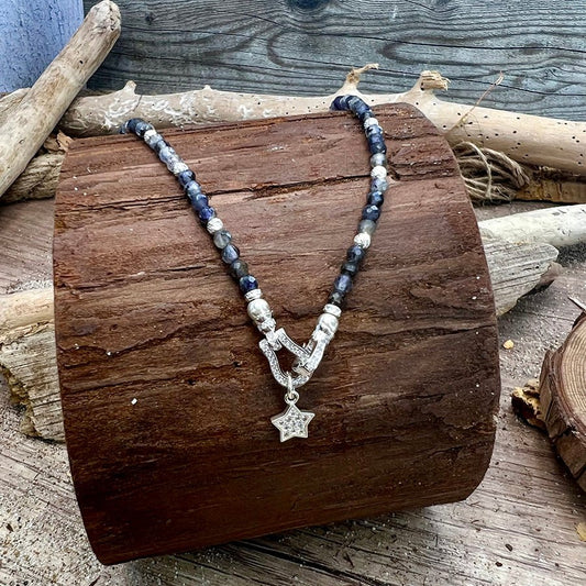 Collier perles femme GLOW JOB, HONEY – perles de cordiérite facettées, & pendentif étoile pavée de zircons et fermoir bijou fer à cheval zircons en argent 925