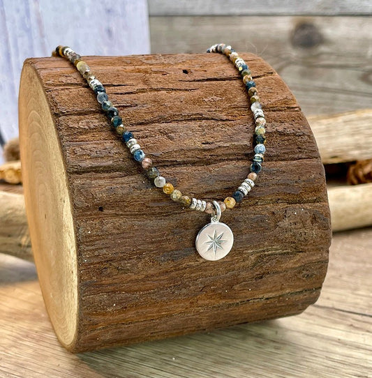 Collier perles femme NO COMPASS, NO RULES – perles de piétersite facettées & pendentif médaille rose des vents zircon en argent 925