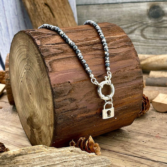 Collier perles femme LOCKED IN LUST – perles de térahertz facettées, & fermoir bouée et cadenas et argent 925
