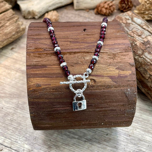 Collier perles femme ROUGE SECRET – perles de grenat facetté, & fermoir toggle torsadé et cadenas en argent 925