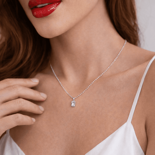 Collier femme FREEZE ME, I’M FABULOUS – chaîne boules facettées scintillantes et pendentif zircon taille émeraude façon diamant, halo zircons, argent 925