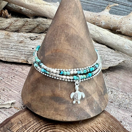bracelet femme multi-rang I DON’T RUSH, I SPARKLE – perles carrées de turquoise véritable, pendentif tortue en argent 925, chaîne boules facettées et argent 925