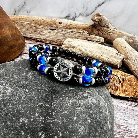 Bracelet homme double-rang BLACK STAR VISION – perles d’onyx 8 mm, perles lumineuses bleues, palet étoile signature et argent 925