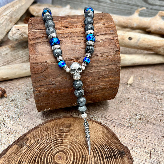 Collier homme BLESS ME DIRTY – chapelet revisité perles de larvikite 8 mm, skull signature et pendentif dague argent 925