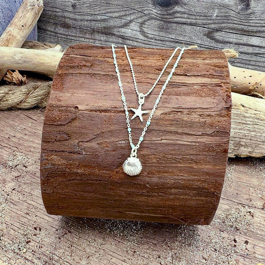 Collier femme double rang THE BEACH IS BACK – chaîne perles émaillées blanches, chaîne boules facettées scintillantes et pendentif étoile de mer argent 925