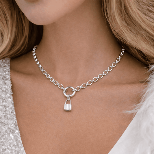 UNLOCK CHAIN NECKLACE WITH JASERON MESH TOGGLE CLASP AND KEY AND PADLOCK PENDANTS IN 925 SILVER