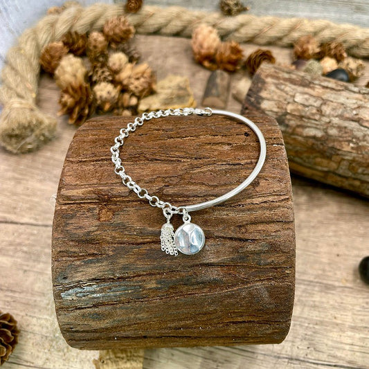 BUBBLY HALF BANGLE BRACELET WITH JASERON CHAIN FISH PENDANT IN 925 SILVER