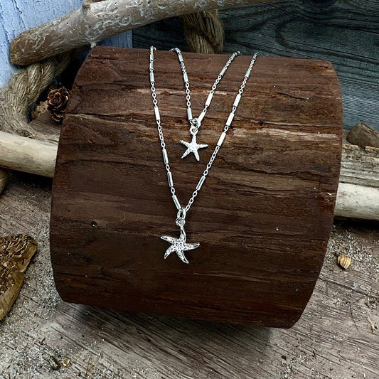 Collier femme double rang BEACH ME TO THE STARS – perles émaillées blanches, pendentif étoile de mer, étoile du Nord zircons, argent 925
