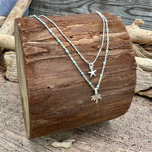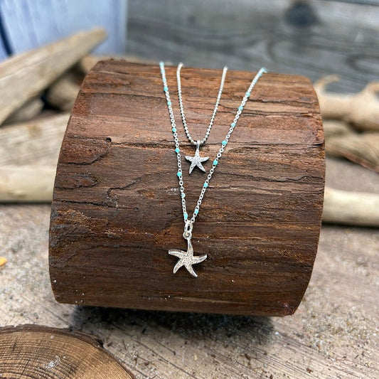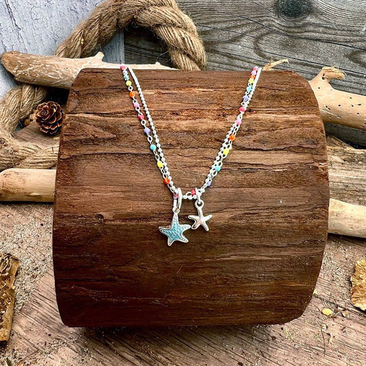 Collier femme double rang STARFISH & REPEAT – chaîne perles émaillées fluo multicolore, chaîne boules facettées scintillantes et double pendentif étoile de mer argent 925
