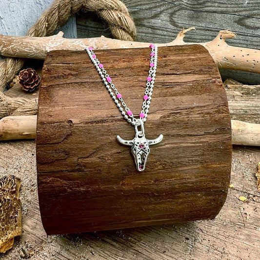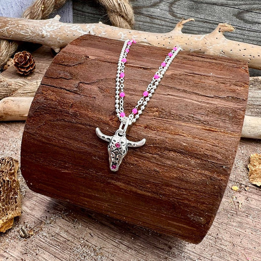 Collier femme double rang TOO PINK TO DIE – chaîne perles émaillées fluo rose et pendentif tête de buffle zircon fuchsia argent 925