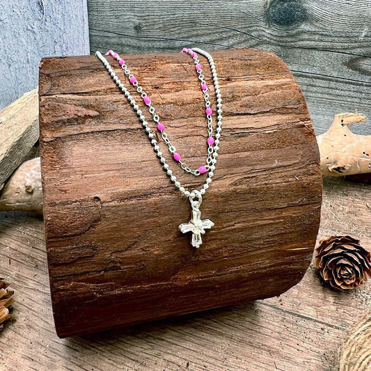Collier femme double rang LIPSTICK & LUST – chaîne perles émaillées rose fluo et pendentif croix zircon fuchsia façon tourmaline en argent 925