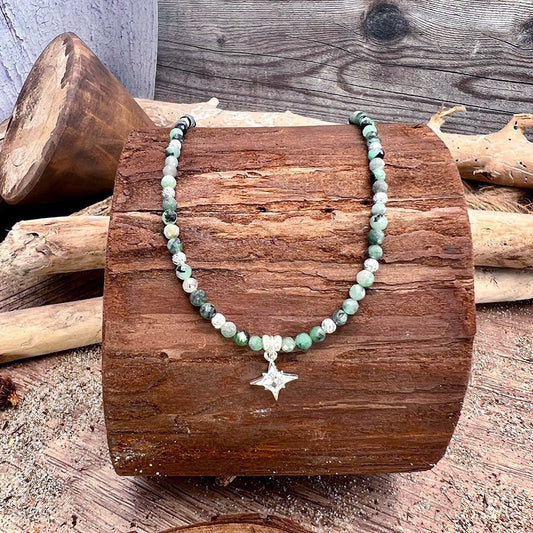 Collier perles femme LUST NORTH – perles d’émeraude facettées & pendentif étoile polaire serti d’un zircon losange et argent 925