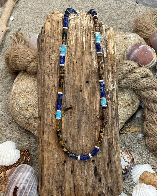 SUPERBANK GENUINE TURQUOISE HEISHI BEADS AND TIGER'S EYE SURFER NECKLACE WITH 925 SILVER CLASP