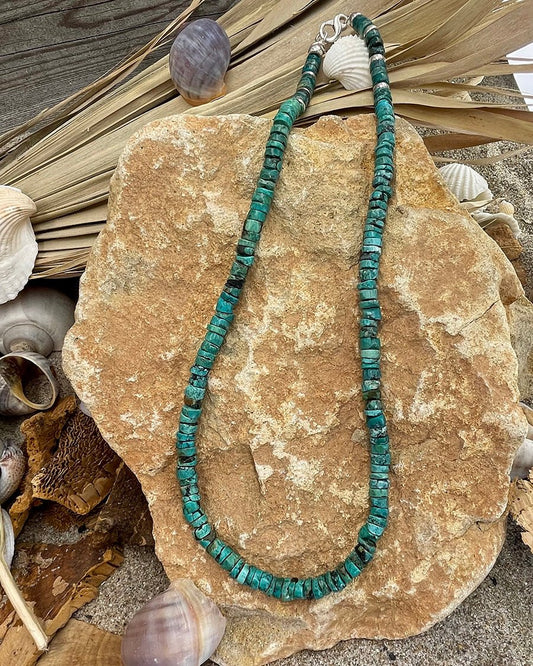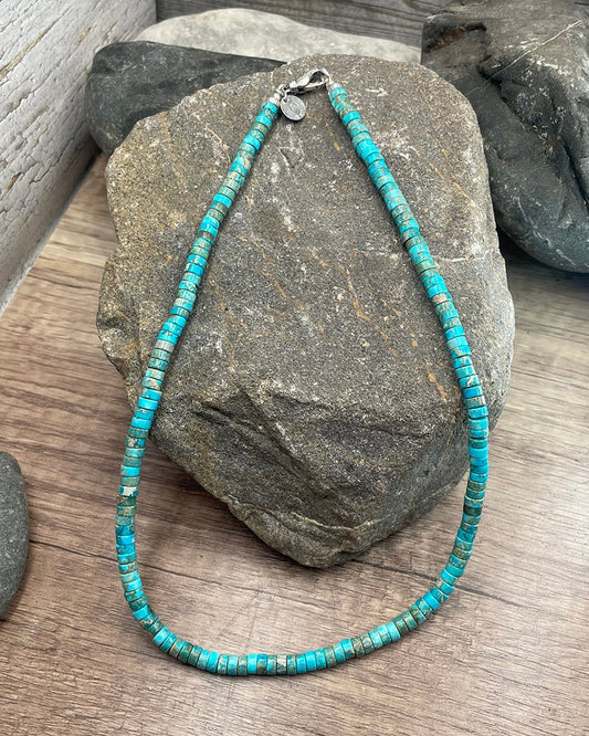 MAVERICKS GENUINE TURQUOISE HEISHI BEAD SURFER NECKLACE WITH 925 SILVER SPACER AND CLASP