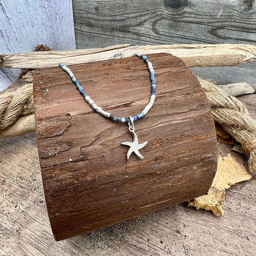 Collier femme BORN TO SPLASH – perles de lapis-lazuli & pendentif étoile de mer pavée en argent 925